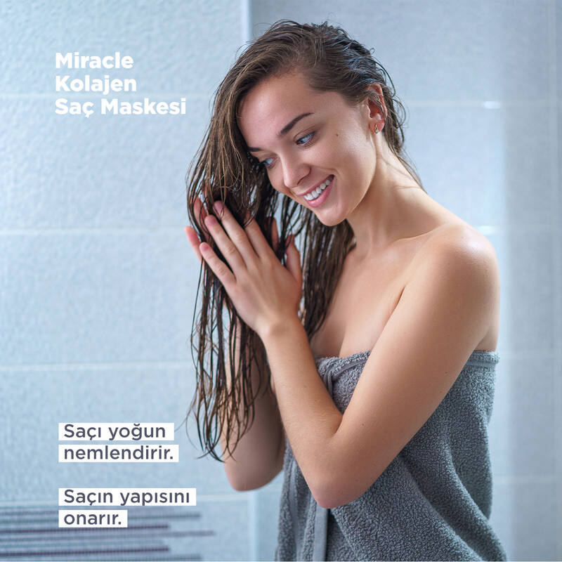 Miracle Collagen Hair Mask, saçları yoğun nemlendirme ve onarım özellikleriyle besleyen özel formüllü bir karışımla zenginleştirilmiştir. Bitkisel keratin ve kolajenin eşsiz karışımı, saç yapısını onarır ve elastikiyeti artırır.